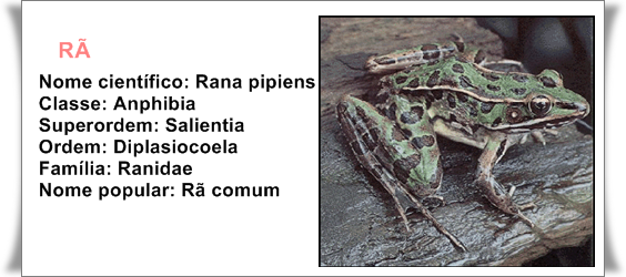 Características: As rãs são animais mais aquáticos de pele fina e úmida, patas fortes e dedos longos. Em geral, alimentam se de caramujos, lesmas e insetos. As rãs comuns não possuem muitos meios de defesa e são presas fáceis de peixes carnívoros, aves pernaltas e cobras. A reprodução começa no fim do inverno, logo após a hibernação. A fêmea põe de 2.000 a 3.000 ovos. As rãs também são muito cobiçadas pelos seres humanos por causa de sua carne, que é muito saborosa.